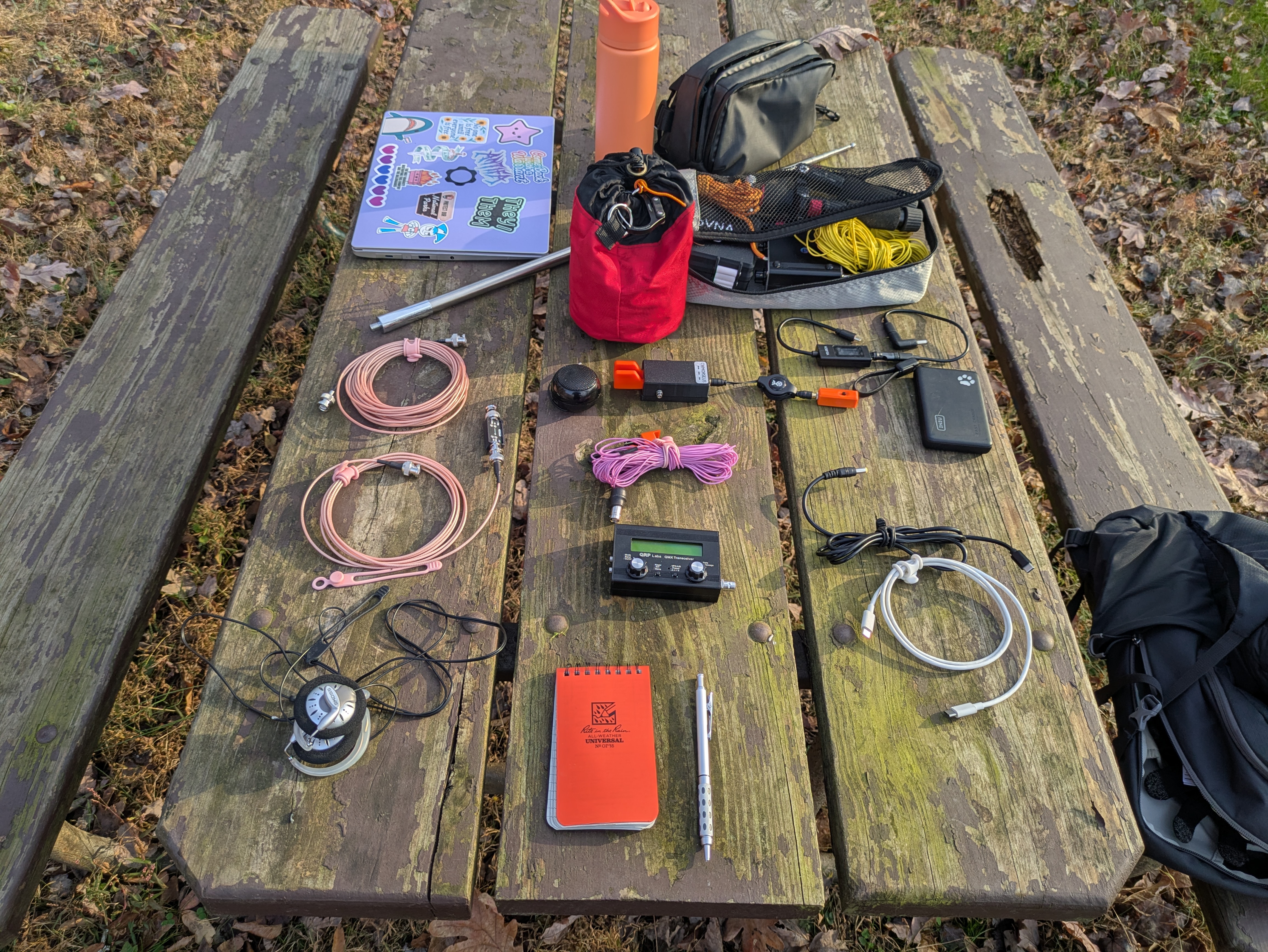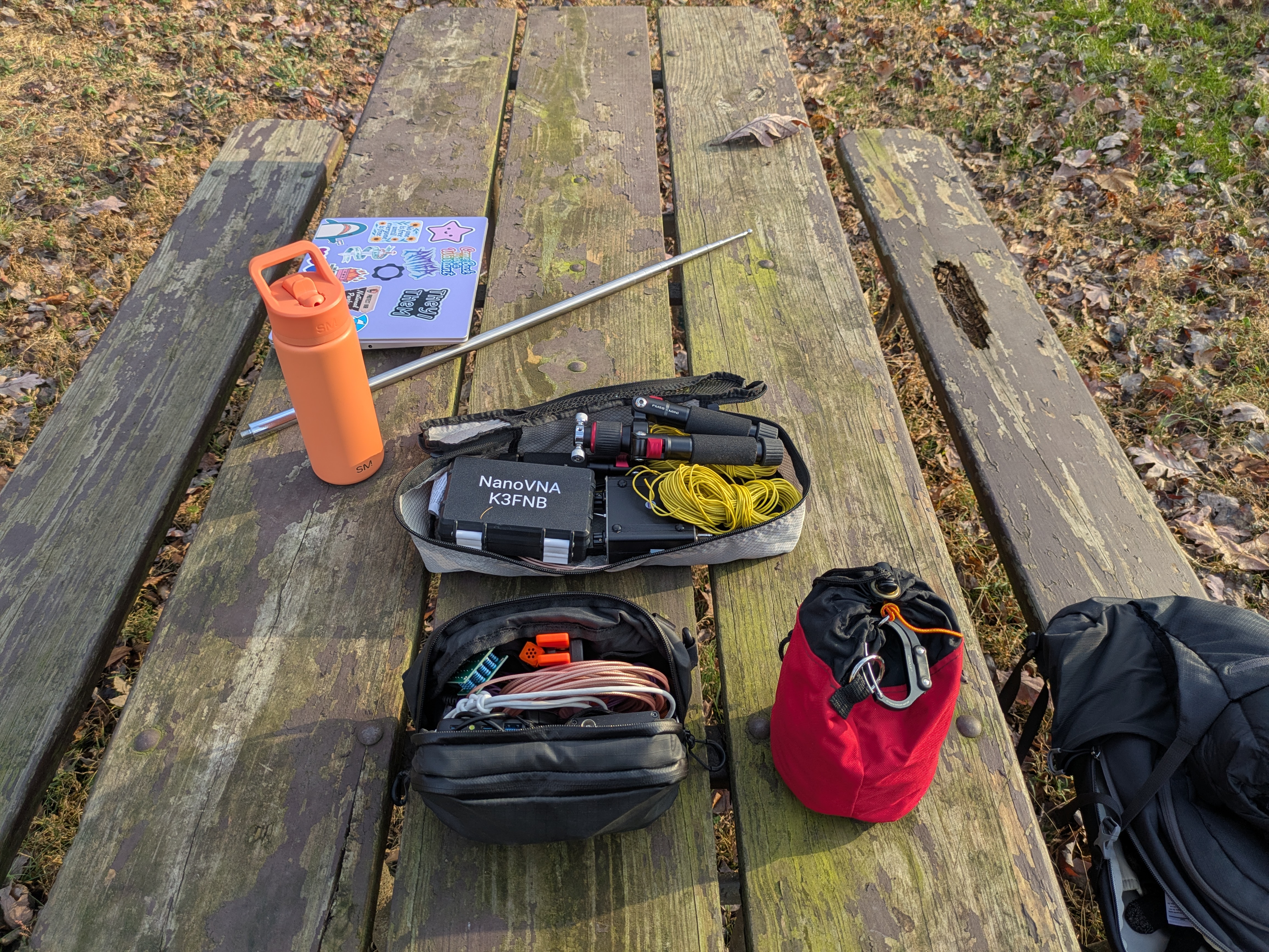 Below that is a Wandrd Large tech pouch I had lying around (product page). It ended up serving as a perfect pouch for the QMX. Inside that pouch is my entire station, including the EFHW. This pouch and my throw line is enough to get on the air.