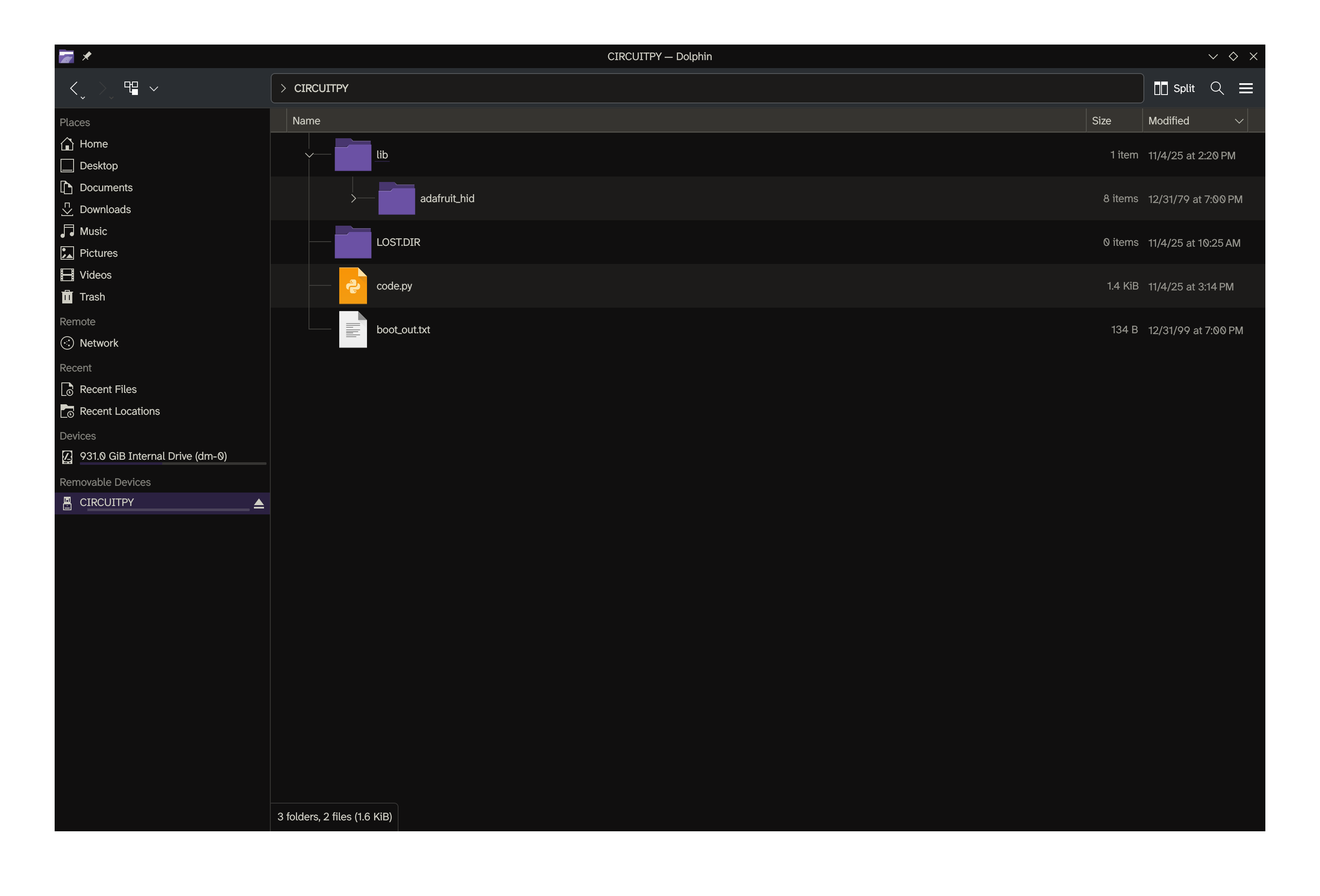 To install Circuit Python onto the board, I followed the Seeed Studio XIAO RP2040 Circuit Python instructions to install the firmware onto the device. The RP2040 board then will became a drive that I can copy code onto.